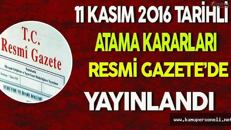 11 Kasım 2016 Tarihli Atama Kararları Resmi Gazete'de Yayınlandı