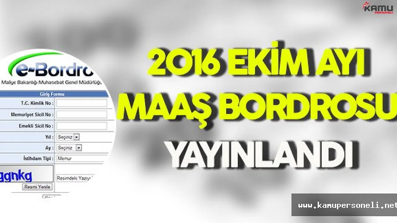 2016 Ekim ayı maaş bordrosu 14 Ekim'de yayınlandı. E-bordo hizmeti ile maaşınızdan ne kadar kesilmiş öğrenebilir, maaş sorgulama işlemlerinizi yapabilirsiniz. E-bordro hizmeti e-devlet şifresiyle giriş yapıldığı için güvenli bir hizmettir.