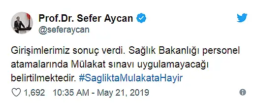 Milliyetçi Hareket Partisi MYK Üyesi Kahramanmaraş Milletvekili TÜSAV Eski Başkanı Prof.Dr. Sefer Aycan resmi Twitter hesabı üzerinden Sağlık Bakanlığı personel atamalarında Mülakat sınavı uygulamayacağı haberini verdi. Aycan açıklamasında "Girişimlerimiz sonuç verdi. Sağlık Bakanlığı personel atamalarında Mülakat sınavı uygulamayacağı belirtilmektedir" ifadelerini kullandı.