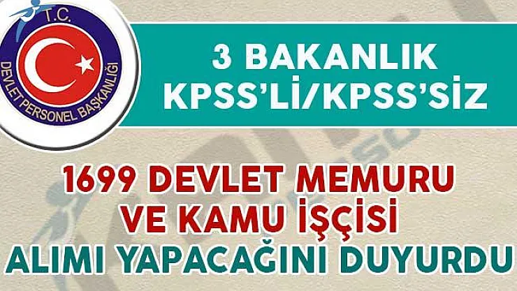 - 3 Bakanlık KPSS'li/KPSS'siz 1699 Devlet Memuru ve Kamu İşçisi Alıyor