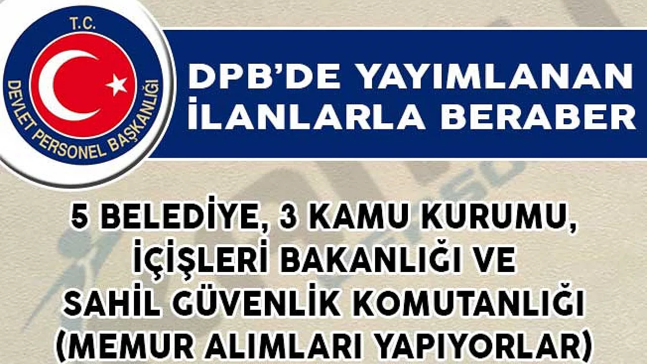 Devlet Personel Başkanlığı (DPB) web adresi üzerinden ilan yayımlayan 5 Belediye, 3 Kamu Kurumu, İçişleri Bakanlığı ve Sahil Güvenlik Komutanlığı memur alımları yapacaklar.