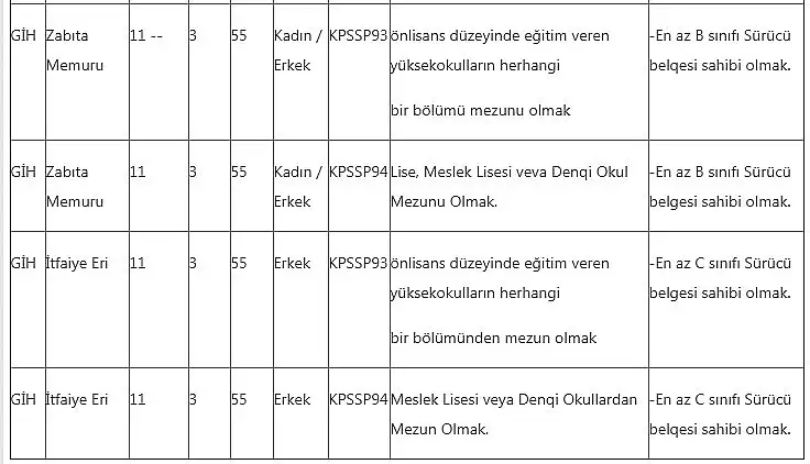 İlan edilen itfaiye eri kadro unvanı için son olarak mezun olunan okul itibariyle öğrenim şartlarını taşımak ve bu öğrenimle ilgili olarak 2016 yılı KPSSP93, KPSSP94 Kamu Personel Seçme Sınavlarına girmiş ve belirtilen asgari KPSS puanını almış olmak Daha önce çalıştığı kamu kurum ve kuruluşlarından disiplinsizlik veya ahlaki nedenlerle çıkarılmış olmamak.