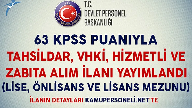 - 63 KPSS Puanıyla Tahsildar, VHKİ, Hizmetli ve Zabıta Alım İlanı Yayımlandı (Lİse, Önlisans ve Lisans Mezunu)