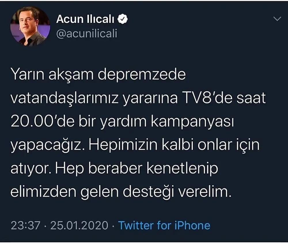 Tv'in sahibi Acun Ilıcalı 26 Ocak Pazar günü saat 20:00'da Tv8'de Elazığ için yardım kampanyası yapacaklarını Twitter'daki sosyal medya hesabından duyurdu.