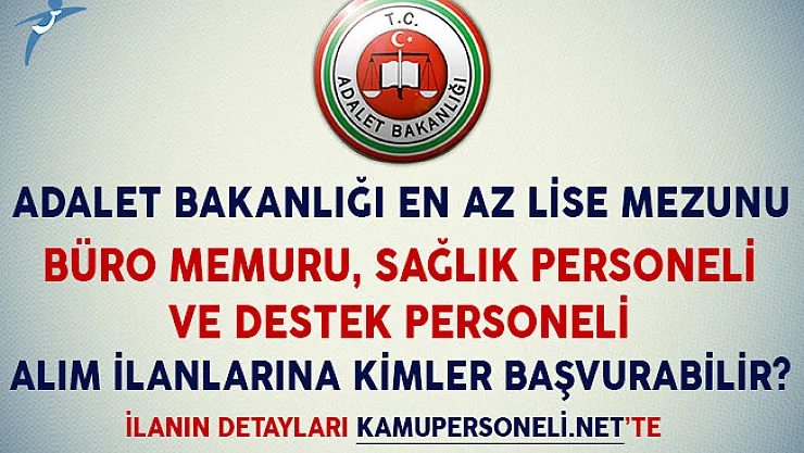 Adalet Bakanlığı tarafından yayımlanan personel alım ilanında Büro Memuru, Sağlık Memuru ve Destek Personeli (Şoför, Teknisyen, Aşçı ve Kaloriferci) alımı için ilan yayımlandı. Bu ilanlara göre bu pozisyonlara yapılacak alımlar şöyle,
