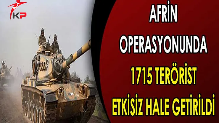 Türk Silahlı Kuvvetleri Genelkurmay Başkanlığının resmi web adresi üzerinden Zeytin Dalı Harekatı hakkında yeni bir duyuru yayımlandı.Yayımlanan duyuruda Afrin'e gerçekleştirilen Zeytin Dalı Harekatında 1715 teröristin etkisiz hale getirildiği ifade edild