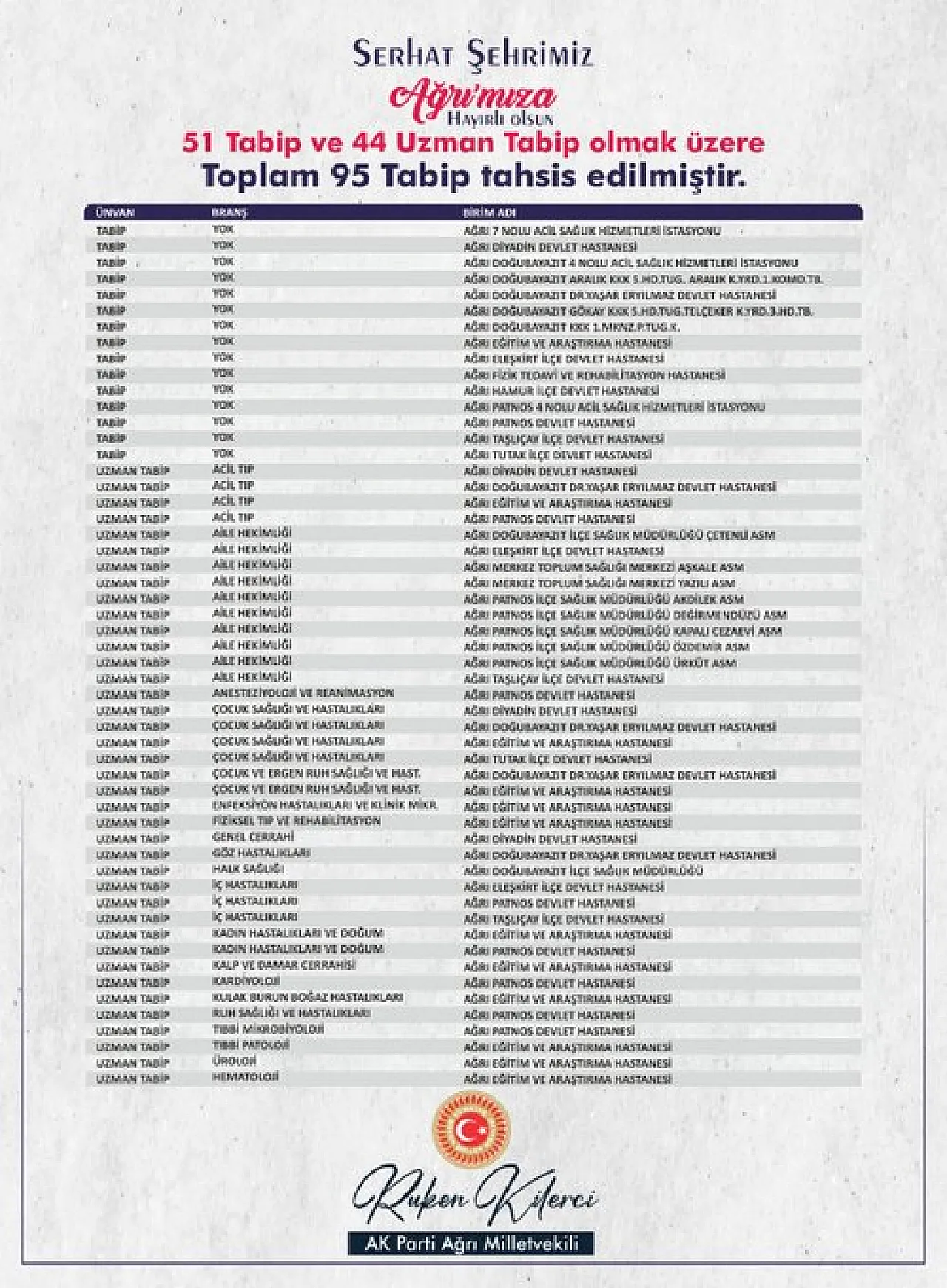Konuyla ilgili sosyal medya hesabından müjdeyi veren Kilerci, her zamanki mütevazı ama vakur duruşuyla halkına seslendi. Sağlık ordusunun büyümesinden duyduğu gururu paylaşan Kilerci, bu atamaların sadece bir başlangıç olduğunu ve Ağrı’yı bölgenin sağlık üssü yapana dek durmayacağını bir kez daha kanıtladı.