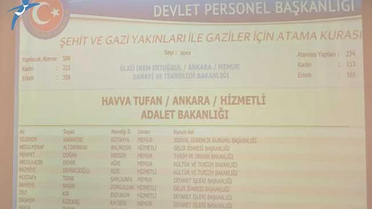 3713 sayılı Terörle Mücadele Kanununun Ek 1 inci maddesi kapsamında, Çalışma ve Sosyal Hizmetler Bakanlığı bünyesinde istihdam edilecek olan 580 şehit yakını, gazi ve gazi yakınımızın atamasının kura sonuçları Devlet Personel Başkanlığı resmi internet sit