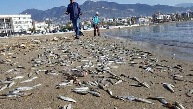 Antalya'nın Alanya ilçesinde bulunan Galip Dere Plajı'nda sahile çok sayıda ölü gümüş balığı vurdu. Ölü balıkları görenler, durumu yetkililere bildirdi.
