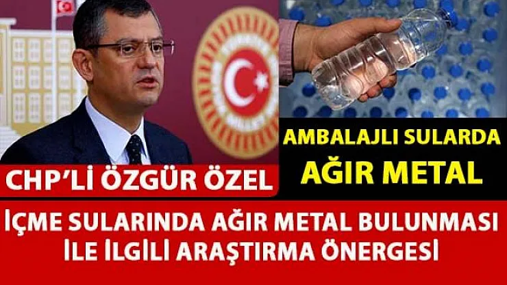CHP Grup Başkanvekili Özgür Özel, ambalajlı içme sularında ağır metal bulunduğu konusu ile ilgili verdiği araştırma önergesi şöyle TÜRKİYE BÜYÜK MİLLET MECLİSİ BAŞKANLIĞINA Halk sağlığı çevre sağlığı koşullarının düzeltilmesi, bireylere sağlık bilgisi v