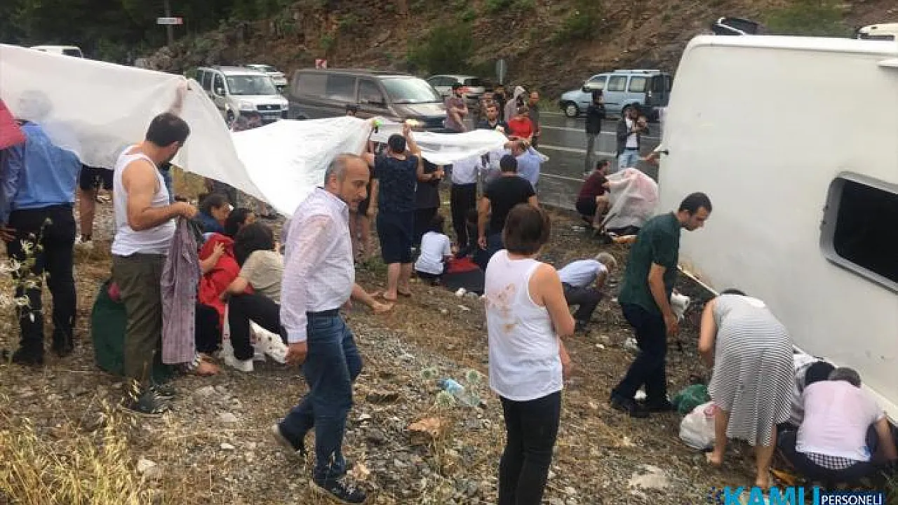 Kaygan yolda direksiyon hakimiyetini kaybeden yolcu otobüsünün devrilmesi sonucunda, 5’i çocuk olmak üzere 20 yolcu yaralandı. Ağır yaralananlar öncelikli olarak en yakın devlet hastanesine kaldırılırken, olay yerine gelen çevredeki vatandaşlar, yağmur altında kalan yaralılara yardım etti.