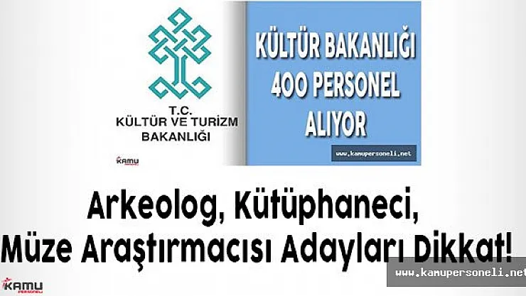 Kültür ve Turizm Bakanlığı, uzun süredir beklenen 400 personel ilanına çıktı.200 Kütüphaneci, 100 Arkeolog, 100 Müze Araştırmacısı pozisyonlarında KPSS (B) grubu KPSS P3 puan sıralaması esas alınmak suretiyle yapılacak sözlü sınav ile toplam (400) adet sö