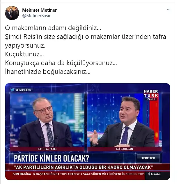Metiner, Ali Babacan'ın canlı yayın görüntüsünü paylaşarak, Babacan'ın makamın adamı olmadığını dile getirerek, "O makamların adamı değildiniz... Şimdi Reis’in size sağladığı o makamlar üzerinden tafra yapıyorsunuz. Küçüktünüz..." ifadelerini kullandı.