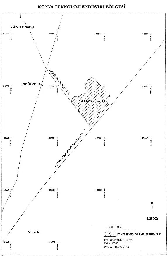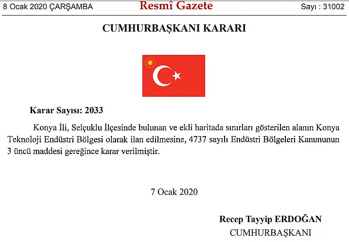 Cumhurbaşkanlığı 2033 sayılı karaırnında, "Konya ili, Selçuklu İlçesinde bulunan ve ekli haritada sınırları gösterilen alanın Konya Teknoloji Endüstri Bölgesi olarak ilan edilmesine, 4737 sayılı Endüstri Bölgeleri Kanununun 3 üncü maddesi gereğince karar verilmiiştir." ifadeleri yer aldı.