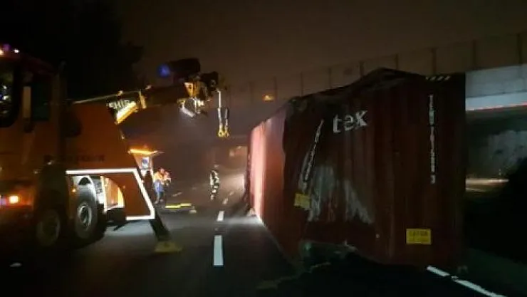 Devrilen konteyner, metrelerce sürüklendikten sonra refüje çarparak durabilirken, kaza nedeniyle yol Yeşilköy istikametinde tamamen araç trafiğine kapandı.