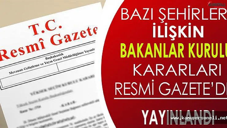 Bazı Şehirlere İlişkin Bakanlar Kurulu Kararları Resmi Gazete'de Yayınlandı