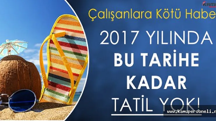 23 Nisan Ulusal Egemenlik ve Çocuk Bayramı, 29 Ekim Cumhuriyet Bayramı, yılbaşı gibi tarihler hep hafta sonuna denk geliyor. Dolayısıyla buradan ek bir tatil çıkma olasılığı bulunmuyor. Bu tatil dışında ilk olarak hafta içine denk gelen tarih 1 Mayıs İşçi Bayramı. 2017 yılının ilk resmi tatili 1 Mayıs İşçi Bayramı olacak.