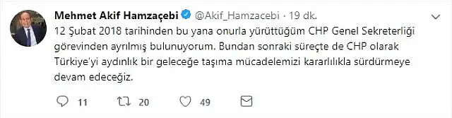 'CHP GENEL SEKRETERLİĞİ GÖREVİNDEN AYRILMIŞ BULUNUYORUM' Hamzaçebi, yaptığı açıklamada, '12 Şubat 2018 tarihinden bu yana onurla yürüttüğüm CHP Genel Sekreterliği görevinden ayrılmış bulunuyorum.Bundan sonraki süreçte de CHP olarak Türkiye'yi aydınlık bir