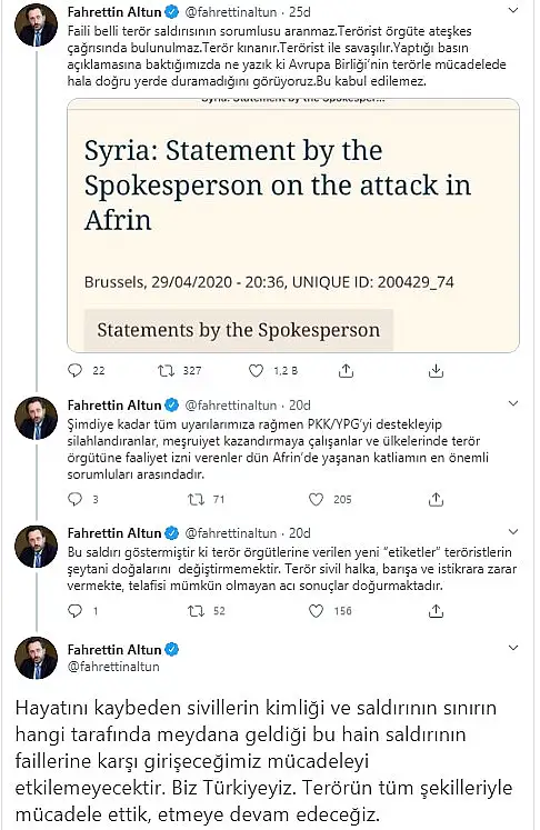 Afrin'de alçak teröristlerin düzenlediği saldırı hakkında açıklama yapan Avrupa Birliği hakkında Cumhurbaşkanlığı İletişim Başkanı Fahrettin Altun sosyal medya üzerinden cevap verdi.