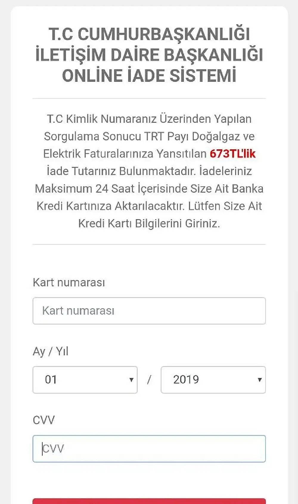 bir internet sitesinde Cumhurbaşkanlığı logosunu kullanan dolandırıcılar, Türkiye Cumhuriyeti iletişim Başkanlığı adıyla elektrik ve doğalgaz faturalarına yansıtılan TRT payını iade ettiklerini söyleyerek, vatandaşlardan kredi kartı numarasını istiyor.Kendilerine para ödeneceğini düşünerek kredi kartı bilgilerini sisteme giren vatandaşlar ise dolandırılıyor.