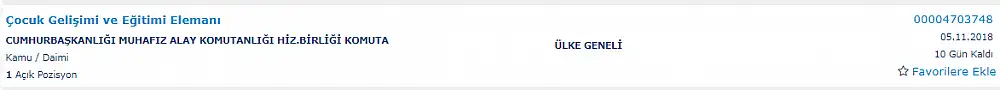 Cumhurbaşkanlığı Muhafız Alay Komutanlığı tarafından yayımlanan ilanda alım yapılacak olan kadro ise "Çocuk Gelişimi ve Eğitimi Elemanı" olarak açıklandı.