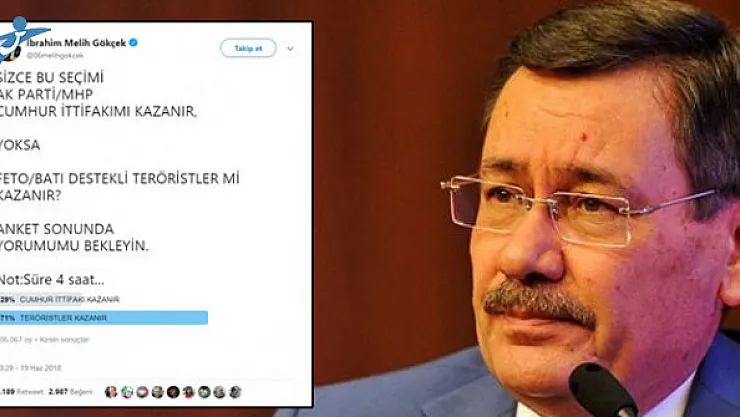 Gökçek, Twitter hesabından yaptığı anket içerisinde; “Sizce bu seçimi AK Parti/MHP Cumhur İttifakı mı kazanır, yoksa FETÖ/Batı destekli teröristler mi kazanır? Anket sonunda yorumumu bekleyin. Not: Süre 4 saat…” ifadelerini kullanmış ve saatler içerisinde yankıları twitter gündemini sallamıştı.