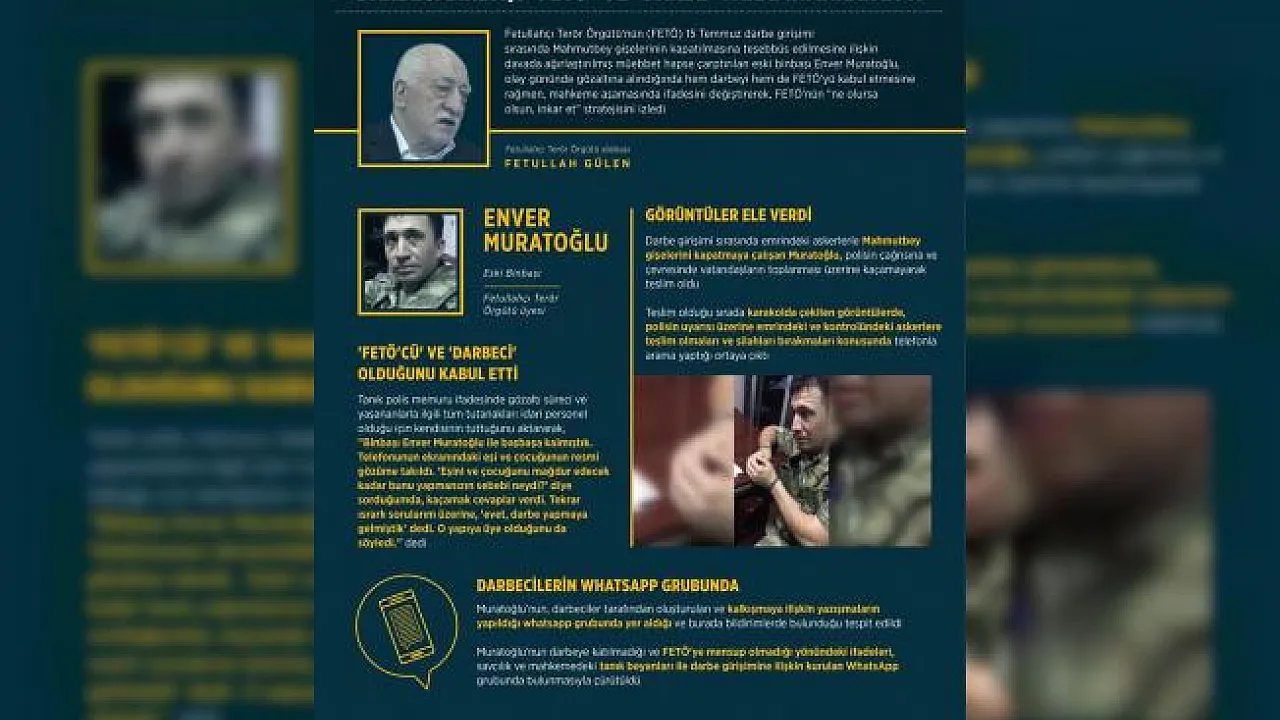Fetullahçı Terör Örgütü'nün (FETÖ) 15 Temmuz darbe girişimi ile ilgili ağırlaştırılmış müebbete mahküm edilen darbeci binbaşı Enver Muratoğlu, olay gününde gözaltına alındığında hem darbeyi hem de FETÖ'yü kabul etmesine rağmen, mahkeme aşamasında ifadesin