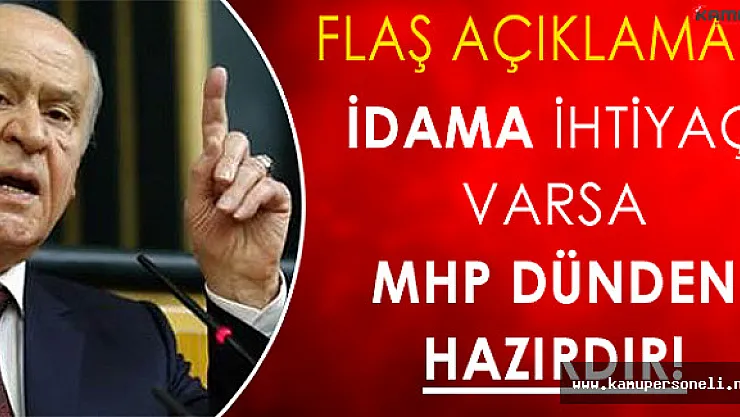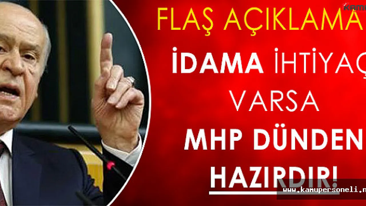 Devlet Bahçeli'den FLAŞ İdam Açıklaması Milliyetçi Harekat Partisi Lideri Devlet Bahçeli, Partisinin TBMM Grup toplantısında önemli açıklamalarda bulundu. Devlet Bahçeli , idam tartışmaları ile ilgili son noktayı koydu. Bahçeli :" Madem idam cezasına ihtiyaç vardı, o halde bahaneye, fuzuli şeylere gerek yok AK Parti hazırsa Milliyetçi Hareket Partisi dünden hazırdır" dedi.