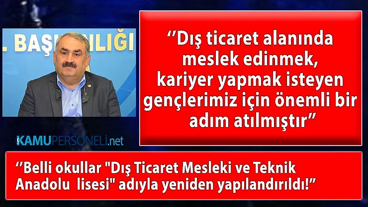 HALİL ETYEMEZ (Konya) - Ticaret Bakanlığımız, Millî Eğitim Bakanlığımız ve Türkiye İhracatçılar Meclisinin ortak çalışmasıyla belli okullarımız "dış ticaret mesleki ve teknik Anadolu lisesi" adıyla yeniden yapılandırılmıştır. Bu çalışmayla dış ticaret alanında meslek edinmek, kariyer yapmak isteyen gençlerimiz için önemli bir adım atılmıştır.