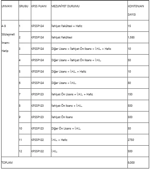 Başkanlığımız taşra teşkilatındaki sözleşmeli pozisyonlara; 2018 yılı KPSS puan sırası esas alınarak her bir grup için tabloda belirtilen boş kadro sayısının 3 (üç) katı sözlü sınava çağrılacak adaylar arasından sınav sonucu başarı sırasına göre 4-B sözleşmeli Kur'an kursu öğreticisi, imam-hatip ve müezzin kayyım alınacaktır.