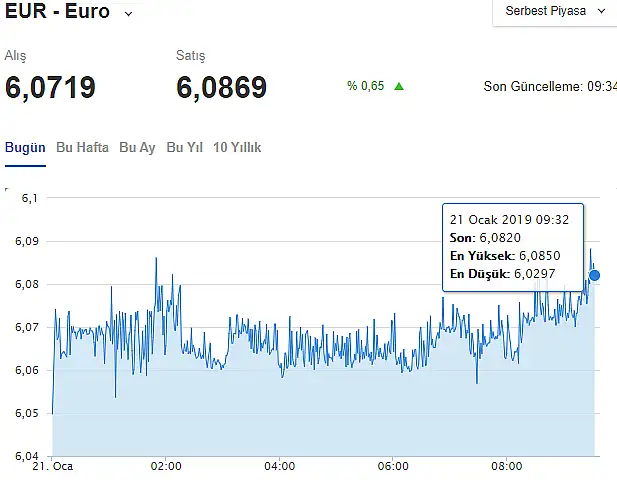 Ocak ayına 6.18415 lira ile başlayan Euro kuru, 26/12/2018 tarihinde 5,9973 lira ile son bir ayın en düşük, 09/01/2019 tarihinde ise 6,3466 lira ile son bir ayın en yüksek değerine ulaştı.