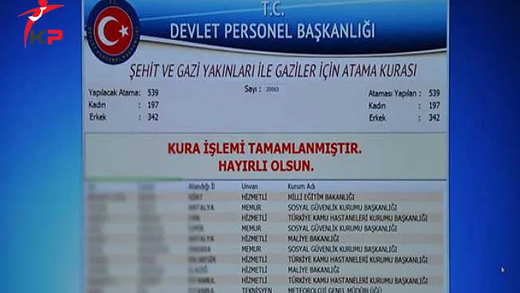 - DPB 539 Şehit Yakını, Gazi ve Gazi Yakını Atama Kurası Sonuçları Açıklandı