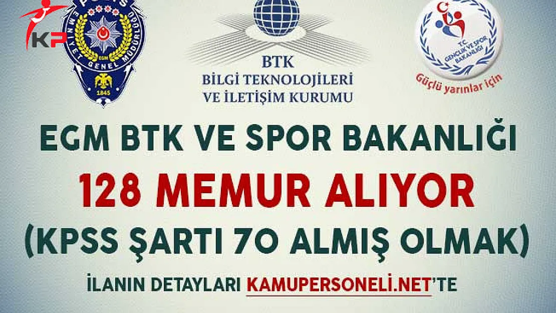 - EGM BTK ve Spor Bakanlığı 128 Memur Alımı Yapıyor (KPSS Puan Şartı 70)