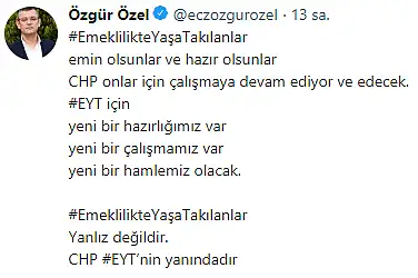 "#EmeklilikteYaşaTakılanlar emin olsunlar ve hazır olsunlar CHP onlar için çalışmaya devam ediyor ve edecek. #EYT için yeni bir hazırlığımız var yeni bir çalışmamız var yeni bir hamlemiz olacak. #EmeklilikteYaşaTakılanlar Yanlız değildir. CHP #EYT’nin yanındadır"