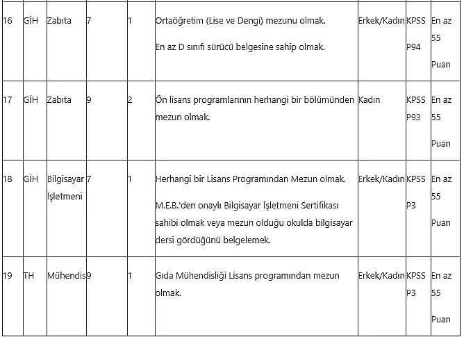c) Zabıta Memuru kadrosu için; 657 sayılı Kanunun 48 inci maddesinin (A) fıkrasında belirtilen genel şartların yanı sıra Belediye Zabıta Yönetmeliğinin 13/A maddesindeki özel şartlara göre, zabıta memuru kadrolarına başvuru yapılabilmesi için; tartılma ve ölçülme aç karnına, soyunuk ve çıplak ayakla olmak kaydıyla erkeklerde en az 1.67 metre, kadınlarda en az 1.60 metre boyunda olmak ve boyun 1 metreden fazla olan kısmı ile kilosu arasında (+,-) 10 kilogramdan fazla fark olmaması ve sınavın yapıldığı tarihte 30 yaşını doldurmamış olmak. Boy ve kilo tespitleri belediyemizce yapılacaktır. Ayrıca bu kadroya başvuracaklar için görevini devamlı yapmasına engel olabilecek bedensel engeli bulunmamak şartı aranacaktır.
