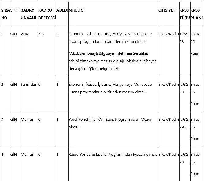 . Diğer memur kadrolarına başvurular şahsen veya iadeli taahhütlü posta yoluyla yapılacaktır.