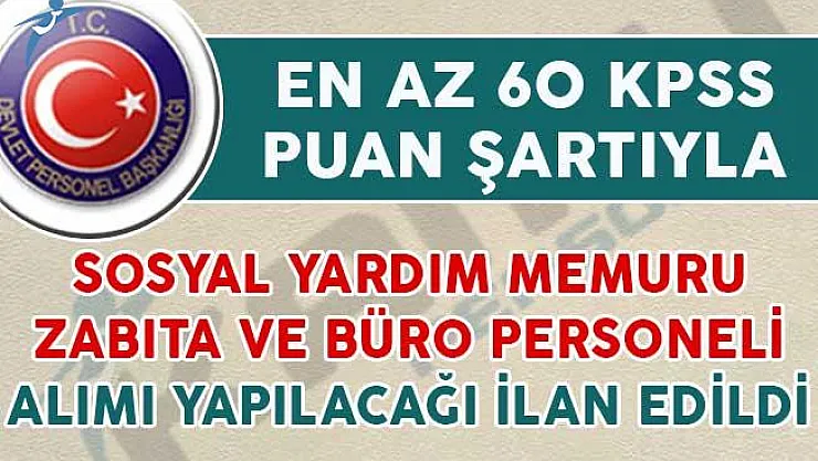 - En Az 60 KPSS Puan Şartıyla Sosyal Yardım Memuru, Zabıta ve Büro Görevlisi Alımı Yapılacağı İlan Edildi