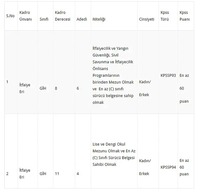 Lüleburgaz Belediyesi’ne 657 sayılı Devlet Memurları Kanununa tabi olarak istihdam edilmek üzere; Belediye İtfaiye Yönetmeliği hükümlerine göre aşağıda unvanı, sınıfı, derecesi, adedi, nitelikleri, KPSS türü, KPSS taban puanı ve diğer şartları taşımak kaydıyla, belirtilen boş kadrolara açıktan atama yoluyla memur alınacaktır.
