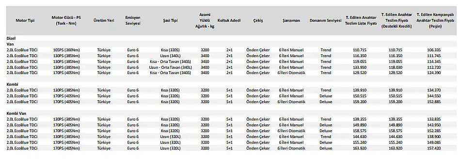 Yeni Ford Tourneo Custom 2018 Fiyat Listesi