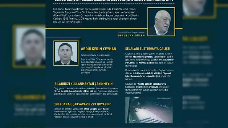 ANKARA (AA) - BARIŞ KILIÇ - Fetullahçı Terör Örgütü'nün (FETÖ) darbe girişimi sırasında Polatlı'daki 58. Topçu Tugayı ile Topçu ve Füze Okul Komutanlığında çalışan ve "anayasal düzeni ihlal" suçundan ağırlaştırılmış müebbet hapis cezası verilen Abdülkerim Ceyhan, "Halkla askerin karşı karşıya kalmasını engellemesi anlamında anonsların durdurulmasının uygun olacağını söyledim." yalanına sığınarak, 15-16 Temmuz 2016 gecesi halkı darbecilere karşı direnişe çağıran selaları susturmaya çalıştığını, aleyhine tanık beyanlarına rağmen inkar etti.