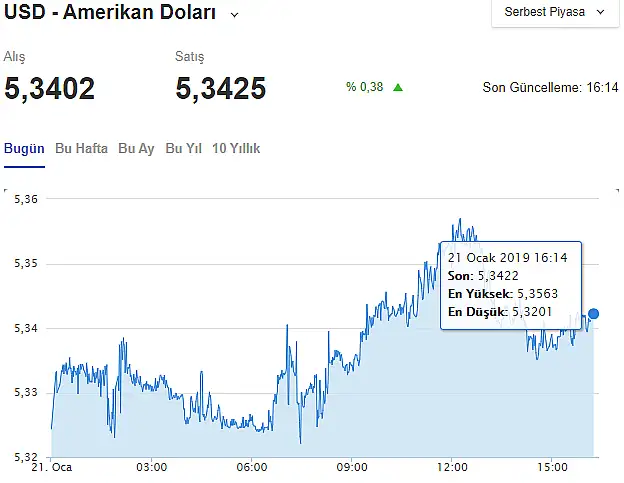 Ocak ayına 5.38585 lira ile başlayan Amerikan Doları kuru, 28/12/2018 tarihinde 5,2680 lira ile son bir ayın en düşük, 09/01/2019 tarihinde ise 5,4906 lira ile son bir ayın en yüksek değerine ulaştı.