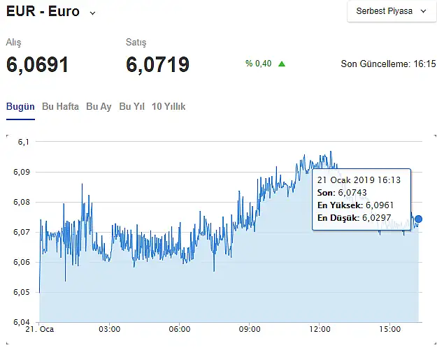 Ocak ayına 6.18415 lira ile başlayan Euro kuru, 26/12/2018 tarihinde 5,9973 lira ile son bir ayın en düşük, 09/01/2019 tarihinde ise 6,3466 lira ile son bir ayın en yüksek değerine ulaştı.