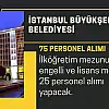 İstanbul Büyükşehir Belediyesi (İBB), bünyesinde çalıştırmak üzere 75 personel alımı yapacağını duyurdu.Alınacak personellerin 50'si en az ilköğretim mezunu engelli, 25'i ise lisans mezunu olacak.