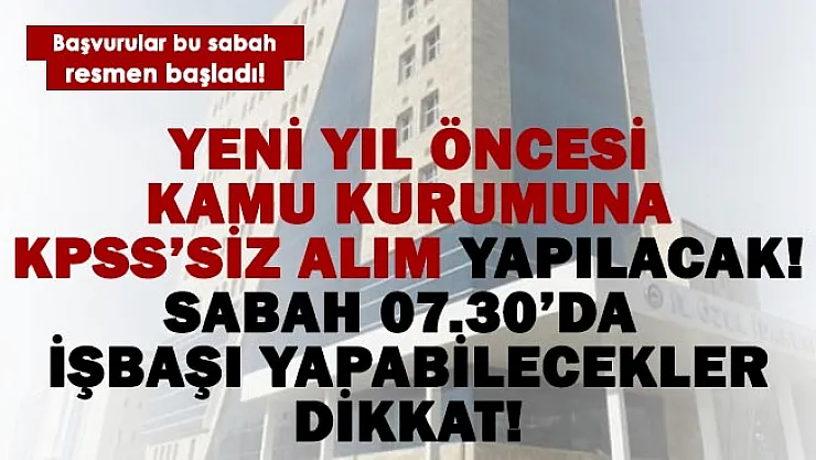 Kamu kurumunda çalışmak isteyenler için İŞKUR üzerinden yeni bir personel alım ilanı yayımlandı. İl Özel İdaresi yeni yıl öncesi alım yapacağını duyurdu. Yapılacak olan alıma sabah saat 07.30'da işbaşı yapabileceklerin başvuracağı ifade edildi. Alımlar daimi olarak yapılacak olup başvurular 20 - 21 Aralık tarihleri arasında alınacak.