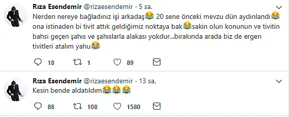 İrem Derici’nin eski eşi Rıza Esendemir, Twitter hesabından, "Kesin ben de aldatıldım" mesajını paylaştı.