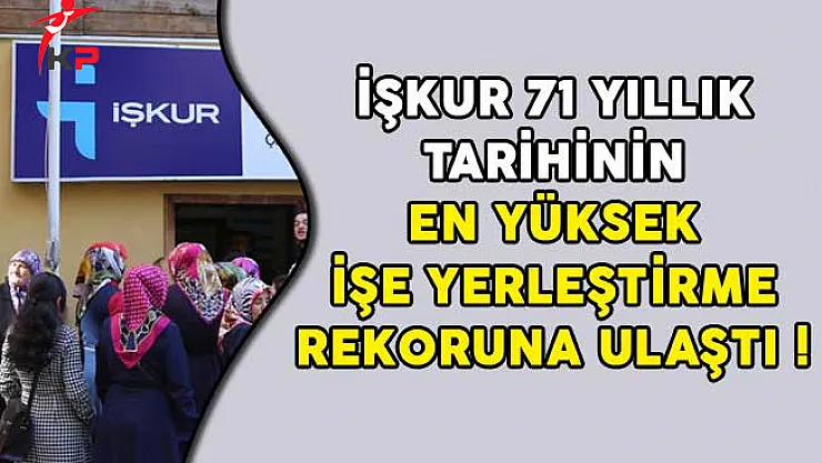 Çalışma ve Sosyal Güvenlik Bakanı Jülide Sarıeroğlu, İŞKUR'a yönelik olarak açıklamalarda bulunarak İŞKUR tarafından işe yerleştirmelerde 71 yıllık tarihi bir rekor kırıldığını sözlerine ekledi.İŞKUR'un son 20 yıl içerisinde gerek yurt içi ve gereksede yu