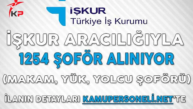 Türkiye İş Kurumu üzerinden yayımlanan şoför alım ilanlarında toplam 5 farklı kadrodan 1254 şoför alımı yapılacağı açıklandı. Kamyon Şoförü, Kamyonet şoförü, Makam Şoförü, Yolcu Taşıma ve Yük Taşıma alanlarından yapılacak alım ilanları, İzmir, Adana, Isparta, Sakarya, Kocaeli, Gaziantep, Manisa, Kütahya İstanbul, Samsun, Ankara, Elazığ başta olmak üzere çok sayıda şehirde yapılacak.