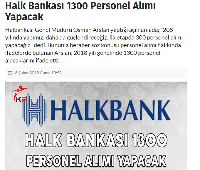 Halk Bankası Genel Müdürü Osman Arslan yapmış olduğu açıklamada 1300 personel alımı yapacaklarını ifade etmiş ve 2018 yılı içerisinde alımların gerçekleştirileceğini ifade etmişti.