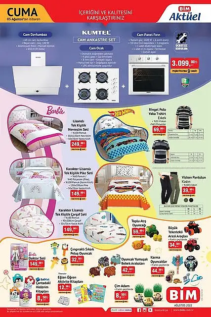 BİM'de bu hafta Ankastre setinden, tek kişilik nevresim setine, polo yaka T-shirtlerden, pantolonlara, çocuk oyun setinden, kahvaltı setine, meşrubat bardağından, cüzdanlara, 8 bölmeli çok amaçlı dolaptan, tencere setine, aşure tenceresinden, aşurelik malzemelere daha birçok ürün raflardaki yerini aldığı belirtilirken söz konusu indirimlerin devam ettiği aktarıldı.