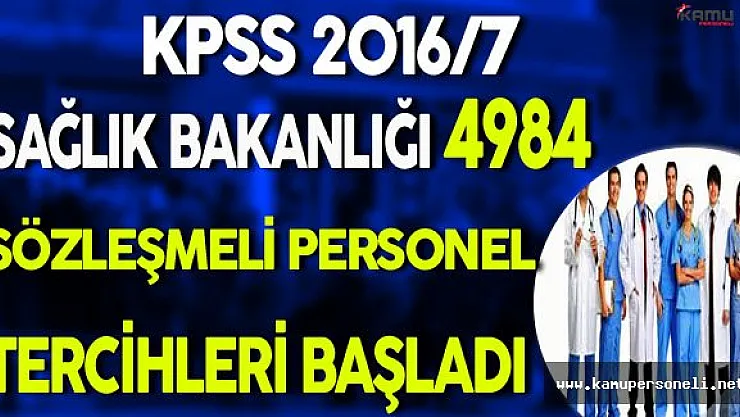 Sağlık Bakanlığı bünyesinde alınacak 4984 sözleşmeli personel alımı için tercih işlemleri başladı. ÖSYM tercih işlemlerinin başladığını web sitesi üzerinden duyurdu. Başvuru yapacak adayların tercih işlemleri 28 Ekim- 3 Kasım 2016 tarihleri arasında ÖSYM üzerinden yapılacak. Adaylar sisteme T.C. kimlik numaraları ve şifreleriyle giriş yaparak tercihlerini yapacaklar. Tercih işlemleri 3 Kasım 23.59'da sona erecek.